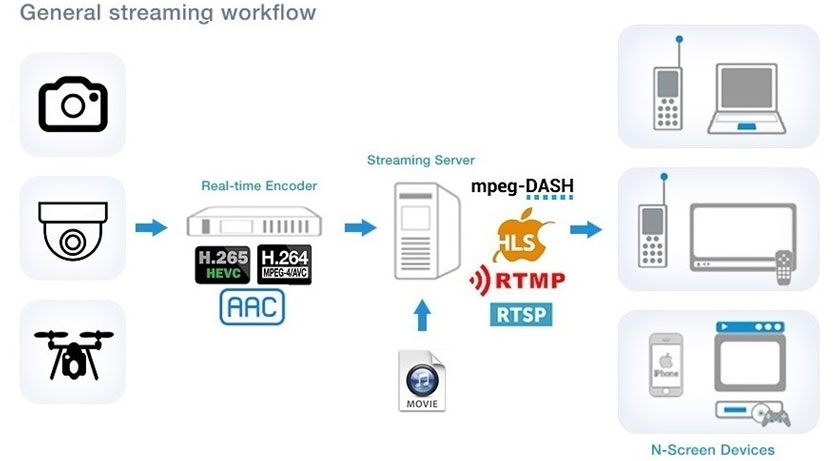 ´Ù¾çÇÑ ¶óÀÌºê ¼Ò½º¸¦ Áö¿øÇϴµ¥ IP Camera·ÎºÎÅÍ´Â RTP/RTSP ½ºÆ®¸²À» PullÇϰí, H.265/H.264 ½Ç½Ã°£ ÀÎÄÚ´õ·ÎºÎÅÍ´Â TS ½ºÆ®¸²À» ¼ö½ÅÇÏ¿© ½ºÆ®¸² ¼¹ö·Î Àü¼ÛµÇ¸é¼¹ö¿¡¼´Â ¼ö½ÅµÈ ½ºÆ®¸²À» RepackingÇÏ¿© ´Ù¾çÇÑ ´Ü¸»±â¿¡¼ Àç»ýÇÒ ¼ö ÀÖ´Â END-to-END ¼Ö·ç¼ÇÀ» Á¦°øÇÕ´Ï´Ù.