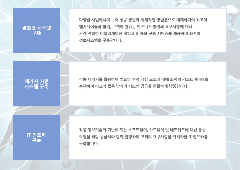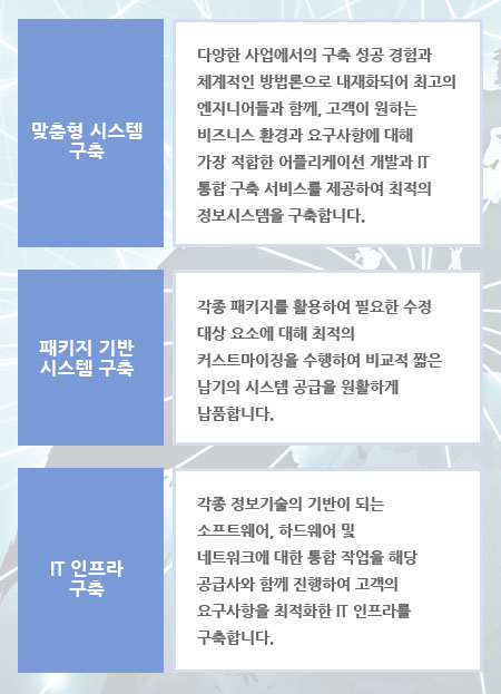 °í°´ÀÌ ÇÊ¿ä·Î ÇÏ´Â Á¤º¸½Ã½ºÅÛÀ» ±âȹ¿¡¼ºÎÅÍ °³¹ß, ±¸Ãà ¹× ¿î¿µ±îÁöÀÇ ¸ðµç IT ¼ºñ½º¸¦ ¼ÒÇÁÆ®¿þ¾î, Çϵå¿þ¾î ¹× ³×Æ®¿öÅ© µî ¼ö¸¹Àº ¿ä¼ÒµéÀ» °áÇÕ½ÃÄÑ °í°´ÀÌ ¸¸Á·ÇÏ´Â ÃÖÀûÀÇ ½Ã½ºÅÛÀ» ÅëÇÕ ±¸ÃàÇϰí Á¦°øÇÕ´Ï´Ù.